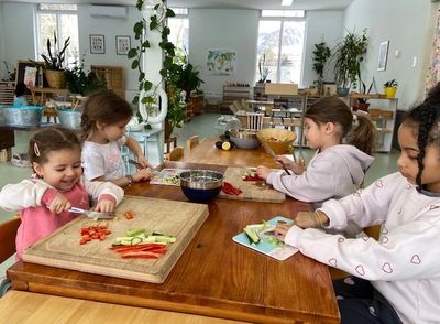 Our meals are made from whole ingredients and are plant-based. Whenever possible, our students in the Elementary and Casa classes are involved in some type of meal preparation. Sometimes they prepare meals from scratch, for example, bean salads or nourishing “bowls.” At times the Elementary class prepares the meal of the day in the kitchen, and other times they simply help by cutting ingredients for the meals.